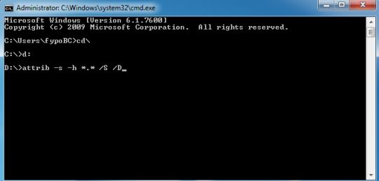 - Kemudian ketikkan attrib s h *.* /S /D dan tekan enter.