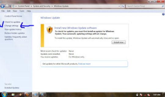 - Setelah kamu masuk ke menu windows update, klik change settings pada sidebar bagian kiri untuk mematikan windows update.