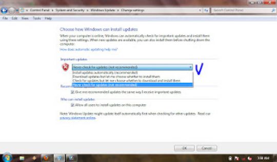 - Pada important update, klik dan pilih never check for updates, kemudian klik OK pada tombol bagian bawah.