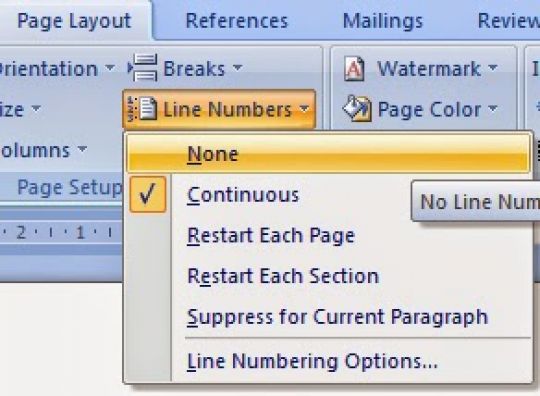 - Selanjutnya muncul popup menu yang ditawarkan untuk membuat line number, kemudian pilih continuous untuk memunculkan nomor baris.