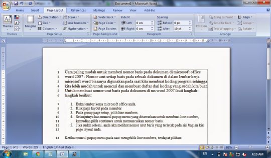 Cara paling mudah untuk memberi nomor baris pada dokumen di microsoft office word 2007 – Nomor urut setiap baris pada sebuah dokumen di dalam lembar kerja microsoft word biasanya digunakan pada saat kita membuat koding program sehingga kita lebih mudah untuk mencari dan membuat daftar dari koding yang sudah kita buat. Untuk membuat nomor urut baris pada dokumen di ms word 2007 ikuti langkah berikut ini: