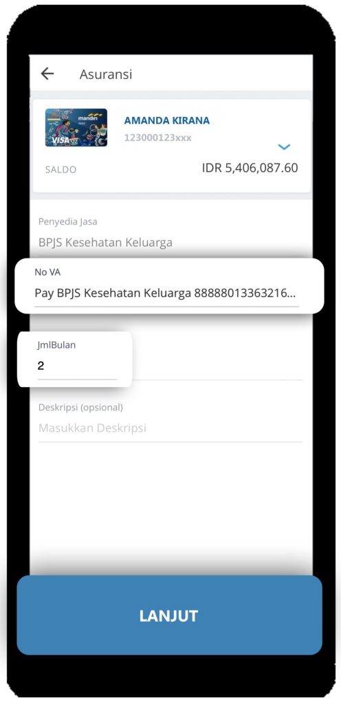 Masukkan Nomor VA BPJS anda, tentukan Jumlah Bulan yang ingin anda bayar kemudian Lanjut. Transaksi selesai setelah anda Konfirmasi dan memasukkan MPIN.