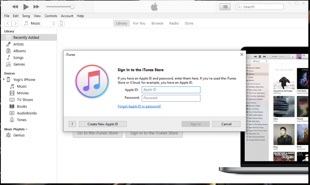 Jika ini pertama kalinya kamu menghubungkan iPhone ke laptop melalui iTunes, maka login terlebih dahulu dengan mengakses Account > Sign In > Masukkan detail Apple ID kamu untuk login.
