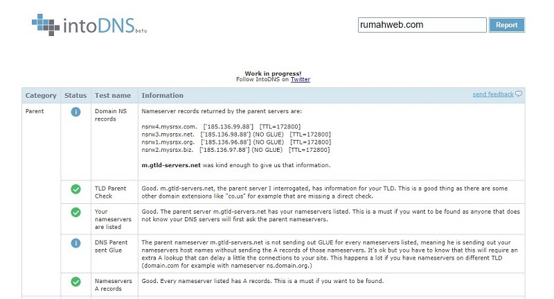 Selain menginformasikan kemana sebuah DNS diarahkan pada domain, IntoDNS juga akan menampilkan informasi seperti Glue record, NS record, hingga SOA record.