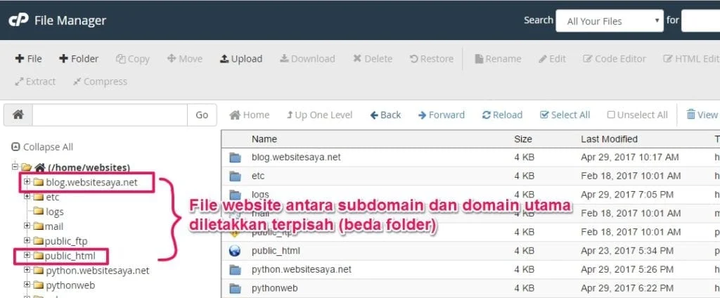 Kasus ini khusus untuk kamu yang ingin melakukan instalasi website di subdomain atau Add- On Domain. Jadi, pastikan kamu melakukan instalasi website/ meletakkan file website di folder yang terpisah dari public_html (beda folder). Hal ini dikarenakan untuk mengantisipasi ketika ada serangan dari hacker, website yang berada di subdomain/ add- on domain tidak akan diobrak- abrik.