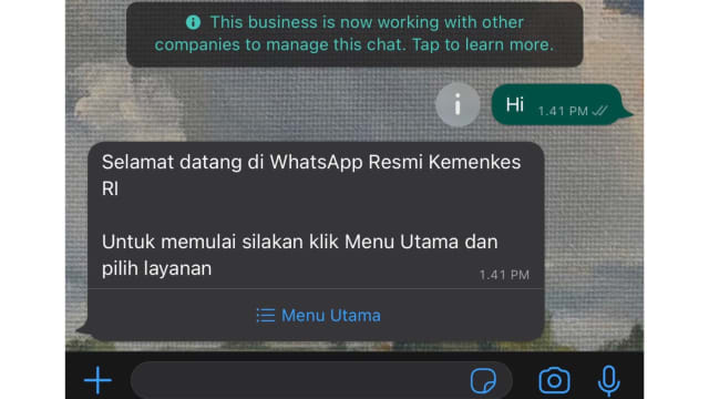 Simpan nomor WhatsApp 0811-1050-0567 milik Kemenkes dan kirimkan pesan “Hai” di room chat kontak Kemenkes.