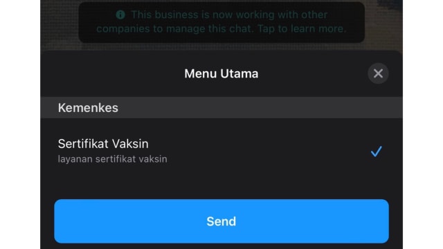 Secara otomatis, kamu akan mendapat balasan pesan yang berisi informasi untuk klik menu utama dan memilih layanan. Lanjutkan dengan klik opsi “Menu utama” kemudian pilih “Sertifikat Vaksin”.