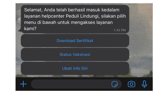 Sebagai informasi, untuk dapat mengunduh sertifikat vaksin lewat WhatsApp hanya bisa dilakukan oleh nomor ponsel yang telah terdaftar sebelumnya di PeduliLindungi. Jika nomor ponsel belum terdaftar, bot chat akan mengarahkan kamu ke platform tersebut.