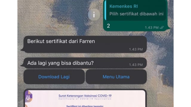 Kamu sekarang bisa mengunduh sertifikat vaksin dari chatbot WhatsApp Kemenkes. Begini caranya.
