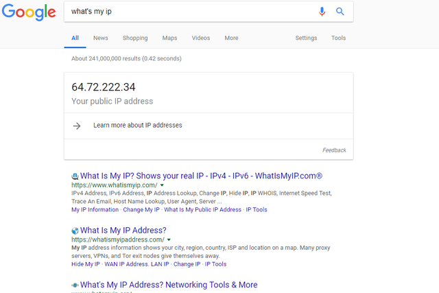 IP komputer yang paling mudah adalah dengan mengetikkan “What’s my IP” melalui mesin pencari Google. Setelah mengetik kalimat tersebut, akan terlihat nomor alamat IP.