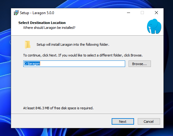 - selanjutnya disini saya default lokasi installasi di partisi “C:\laragon” kemudian klik Next.