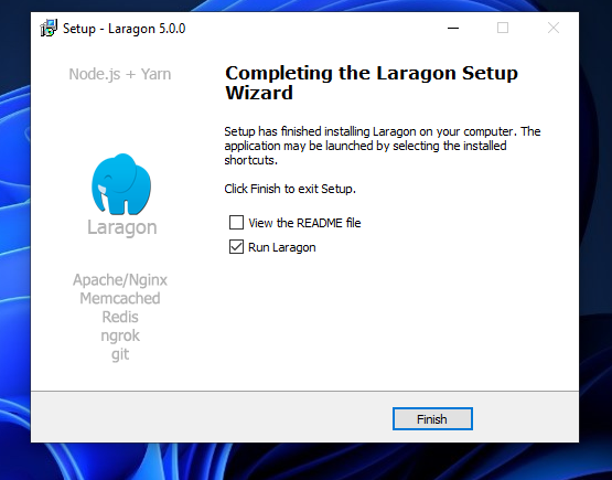 - Proses installasi laragon sudah selesai lalu klik finish.