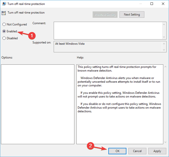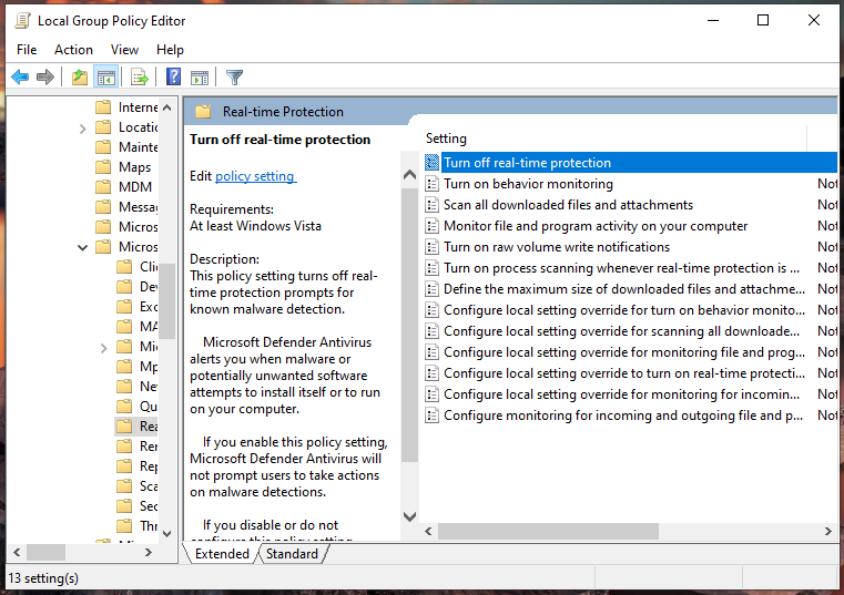 Computer Configuration/Administrative Templates/Windows Components/Microsoft Defender Antivirus/Real-time Protection - ketika berada di folder Real-time Protection kamu buka turn off Real-time Protection lalu klik kiri 2x. seperti di gambar.