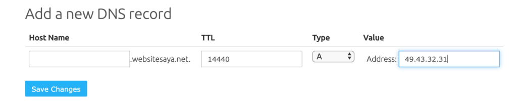 Sekarang saatnya menghubungkan domain ke Cloud VPS. Silakan arahkan A record ke IP Address Cloud VPS. Silahkan klik Add New Record lalu tambahkan IP Address Cloud VPS pada bagian Value. Misalnya 49.43.32.31 , kemudian klik Save Changes.