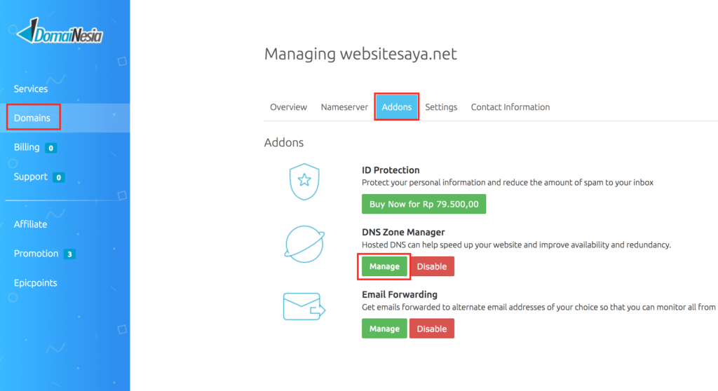 Setelah itu, silakan pilih menu Addons, dan klik Manage pada opsi DNS Zone Manager. DNS Manager berfungsi untuk mengatur domain ingin diarahkan kemana. Nah, di menu DNS Zone Manager ini nantinya akan ada pengaturan A record dan CNAME record.