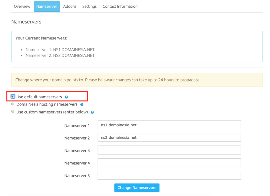 Sekarang silakan arahkan nameserver ke default atau custom nameserver vps yang kamu beli. Kamu bisa klik pada opsi Use Default Nameservers. Jika nameserver tidak berubah setelah diklik, artinya domain tersebut sudah menggunakan nameserver default. Silakan lanjutkan ke langkah selanjutnya.