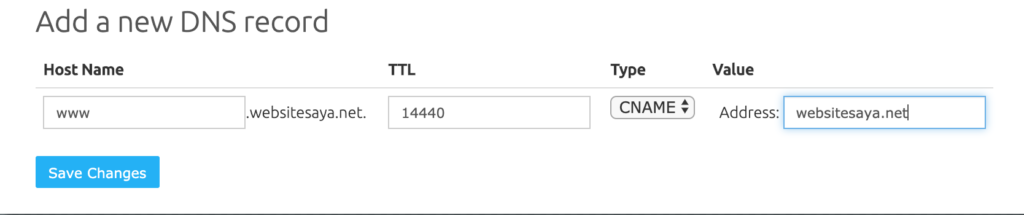 Setelah itu, silakan arahkan CNAME record agar bisa diakses dengan www. Pada bagian host name silakan tuliskan www. Lalu pada bagian Value silakan tulis nama domain kamu. Jika sudah, klik Save Changes