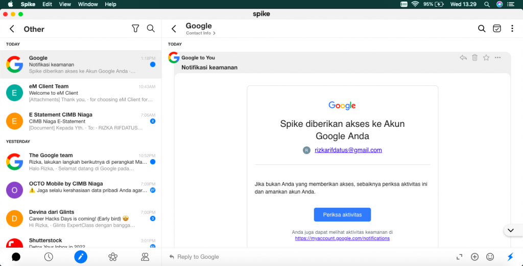Fitur lain yang dimiliki Spike adalah Priority Inbox. Inilah salah satu fitur yang penting untuk menunjang efisiensi dalam bekerja. Sebagai pebisnis, kamu tentu ingin mengetahui email penting dari klien dibandingkan notifikasi dari Facebook, bukan? Spike mengelompokkan email tidak penting ke kategori Other. Jadi inbox utama, hanya berisi email penting saja.
