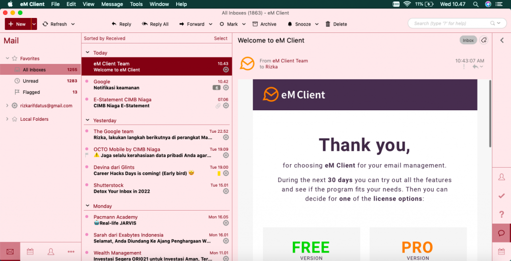 eMClient mendukung pengguna dengan sistem operasi Windows maupun macOS. Email Client satu ini juga memiliki fitur serta layanan yang lengkap mulai dari Backup Tool, Snooze, Deduplicator, Automatic Replies, Archive, dan lainnya.