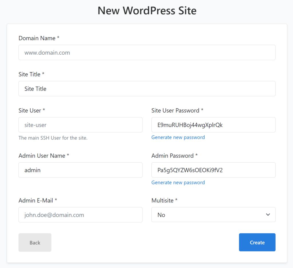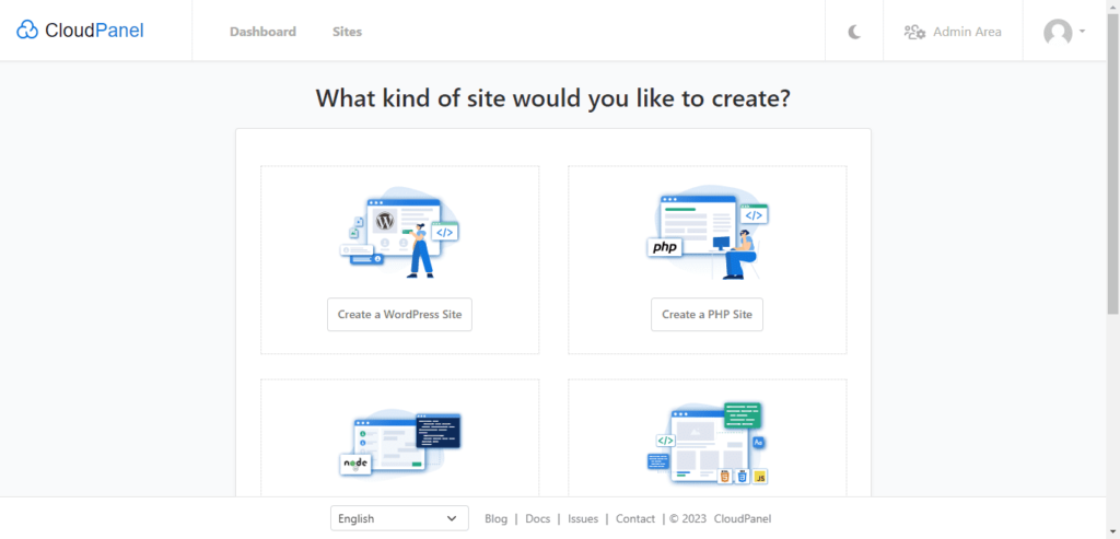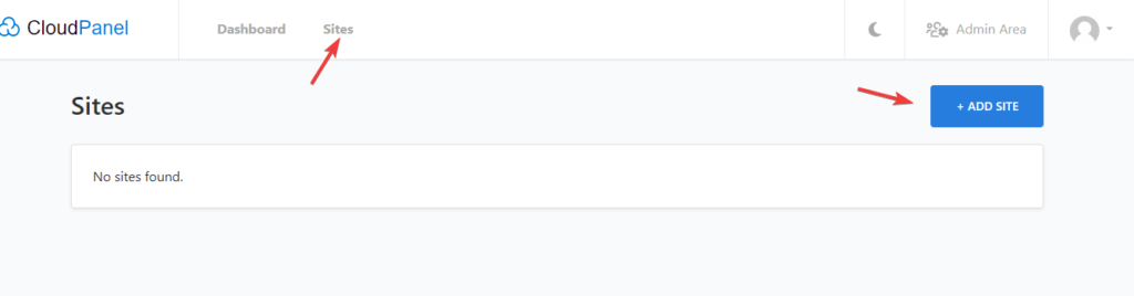 Cloudpanel menyediakan cms wordpress klik menu ->Sites-> Tombol Add Site.