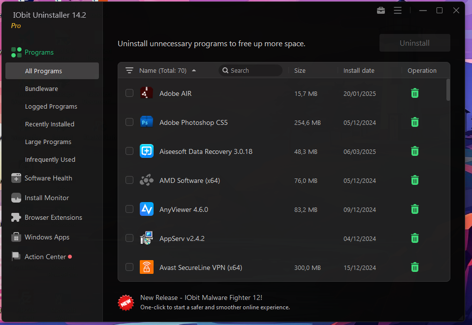 Sesuai dengan namanya, fungsi utama dari IObit Uninstaller adalah untuk menghapus software yang terinstall pada sistem Windows hingga tuntas. Setelah sebuah software diuninstall, IObit memindai sistem untuk mencari dan menghapus file-file sisa hasil uninstall. Dengan demikian file-file yang sudah tidak terpakai tersebut tidak akan menyita ruang harddisk maupun SSD.