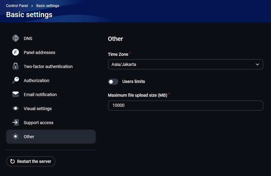 - Klik menu Setting>main>other, ini untuk mengatur waktu sesuai zona, maka saya ganti menjadi asia/jakarta dan juga saya menambah limit upload file agar bisa mengunggah berkas ukuran besar.