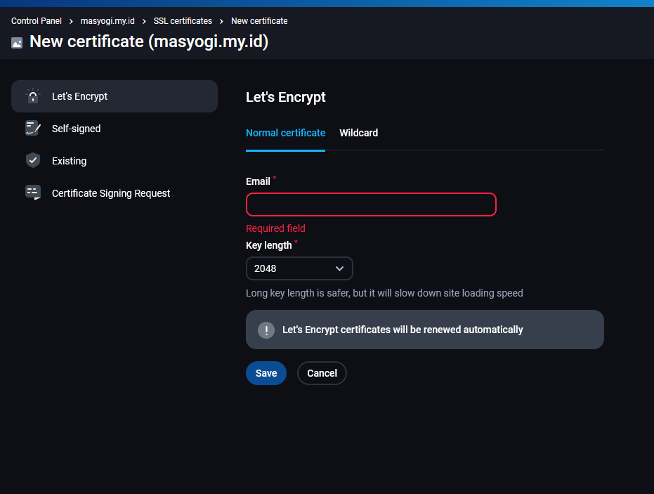 - Disini saya menggunakan Let’s Encrypt dan tentu gratis selamanya, dan klik save.